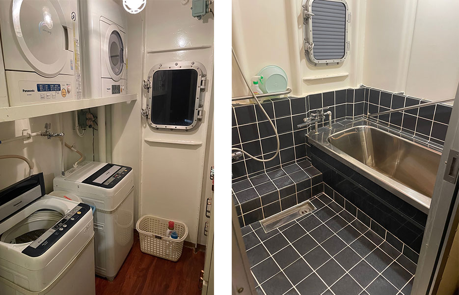 広々とした浴室は船内にいることを忘れてしまいそうな空間です。また、洗濯機・乾燥機も備え付けられ、船内生活を助けています。